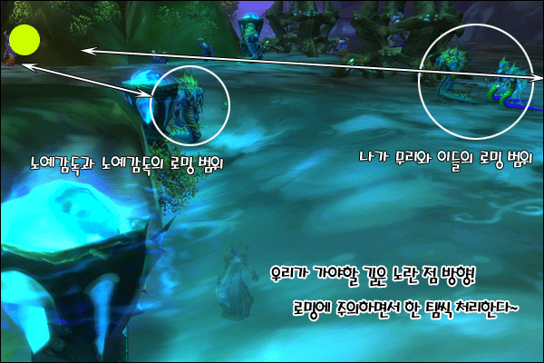 위에 보이는 것처럼 노예감독/ 3마리의 나가 이렇게 두 팀의 로밍이 있다. 3마리의 나가 무리가 우측으로 꽤 멀리 로밍을 가기 때문에 이 기회를 잡아 노예감독부터 처리한 후 3마리를 잡는다. 이때 뒤를 절대 주의해야 한다. 아까 피해온 나가 무리들의 로밍 범위가 닿아 애드가 날 수 있기 때문이다.
