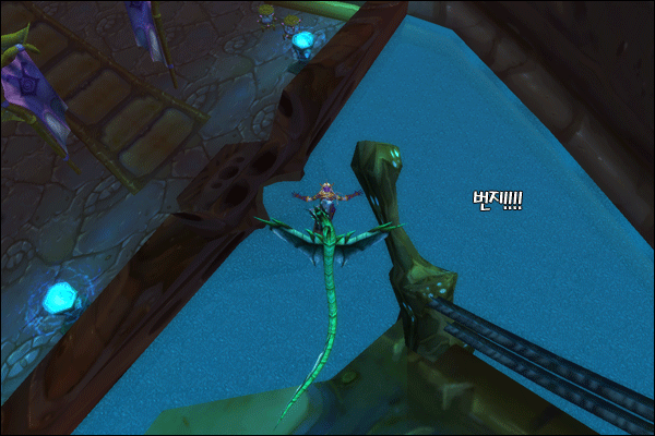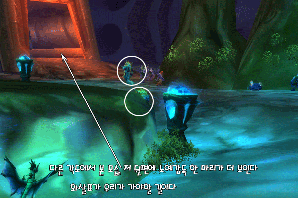 화갈표가 가리키는 곳을 보면 파란 빛을 내는 탑이 보일 것이다. 일단 그곳까지 가면 통과는 성공이다. 무턱대고 달리는 것이 다소 위험하다 생각이 든다면 로밍 몬스터 중 노예감독 한 마리 정도 잡아주는 것도 좋다. 파란 빛을 내는 탑까지 도착했다면 아래 그림과 같은 장면이 연출된다.