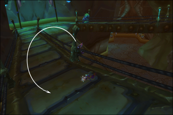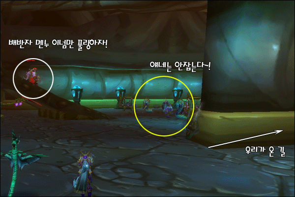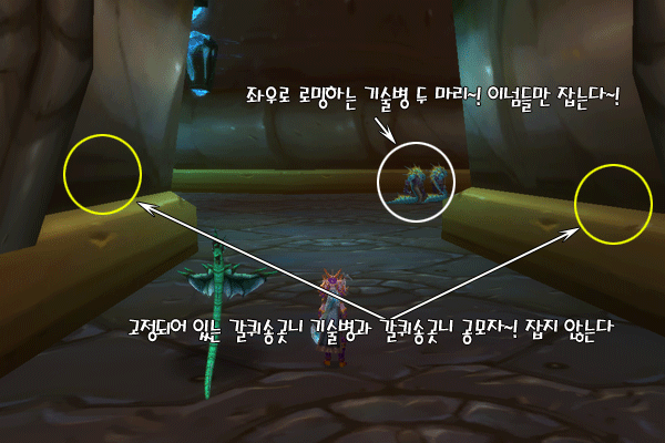우리가 가야 할 통로의 입구쪽에 노예감독 한 마리가 더 있다. 가볍게 풀링하여 잡고 화살표 방향의 통로의 입구까지 가자. 통로의 입구엔 갈퀴송곳이 파수병이 있는데 이들은 은신을 감지하고 방패 밀쳐내기 스킬과 멍해짐 스킬을 사용한다.