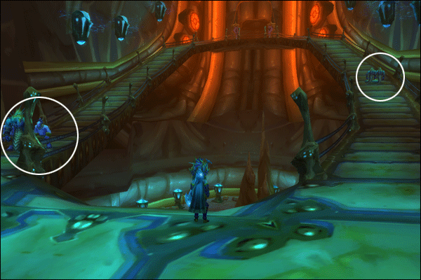나가 몬스터 중 기술병은 광역 화염공격인 불의 비를 사용한다. 불의 비가 시전될 때는 재빨리 피해주면서 캐스팅을 끊는 플레이가 필요하다. 노예들과 달리 나가들에게 투항해버린 드레나이도 있는데 그들이 갈퀴송곳니 공모자다. 근접 공격만을 하며 신경마비 스킬을 사용한다.