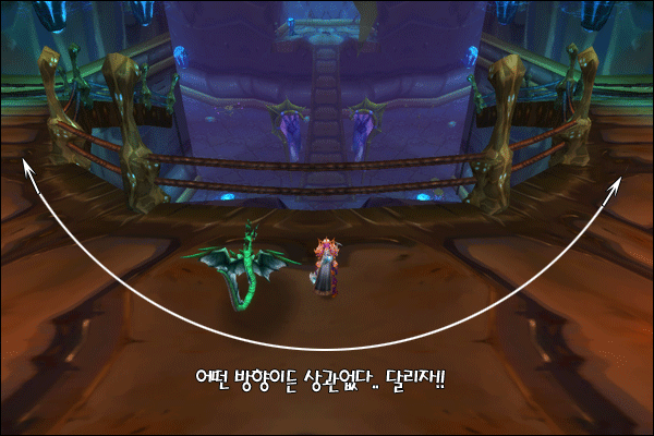 이곳에서 뒤도 안보고 달리는 전략을 쓸 수도 있지만 운 나쁘게 스턴이라도 걸리면 바로 난감한 죽음을 맞이하게 되니 파티 내에 성기사가 없다면 차분히 잡고 가자. 그리 오래 걸리지 않는다. 몇 무리의 로밍들을 처리하며 오르막길을 계속 올라 가다 보면 낭떠러지에 다다른다. 이곳에서 과감하게 번지! 아래의 스샷 참조.
