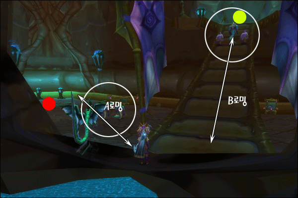 번지 후에 보이는 광경은 오르막길 하나와 왼쪽의 길이다. 위 스샷을 참고하자. 강제 노역소 퀘스트를 가진 파티원이 있다면 B로밍을 처치하고 노란 점을 찍어야 하지만 퀘스트를 가진 파티원이 없다면 B로밍은 패스한 후 왼쪽으로 내려가 A로밍만 차분이 점사한다. 빨간 점이 우리가 가야 할 길목이다.