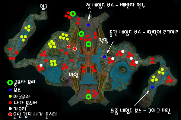 마크루라를 잡고 마주치는 다음 장면에선 꽤 많은 수의 몬스터가 등장하는데 로밍하는 몬스터들의 동선(動線)을 잘만 파악한다면 무혈입성(?)을 할 수 있다. 일단 우측의 고정 몬스터 무리는 신경 쓸 필요가 없고 좌측 두 무리의 로밍 몬스터들만 살피면 되는데 한 마리의 노예감독과 3마리의 나가 몬스터들로 이루어져 있다. 로밍하는 몬스터 두 무리가 모두 좌측 끝으로 빠져 길이 열렸을 때!! 재빨리 뛰어가자^^; 아래의 그림을 참고하면 쉽다.
