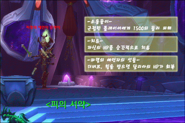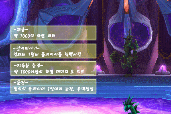 선구자 스키리스의 방에 들어가면 교도관 블러드 엘프 NPC가 있는데 이 몬스터에게 접근하면 총 3마리의 몬스터가 차례대로 등장합니다. 첫 번째는 위상 사냥꾼, 임프 중 1마리가 랜덤으로 등장하고 두 번째는 바람 정령, 설퍼론 용암투척병 중 1마리가 랜덤으로 등장합니다. 세 번째 몬스터는 반드시 용족 드라코나르가 등장합니다. 첫 번째 몬스터는 위상 사냥꾼/임프 중 하나가 등장합니다. 야수형인 위상 사냥꾼은 어렵지 않지만 임프는 끊임 없이 화염피해를 가하기 때문에 다소 주의가 필요한 몬스터입니다. 하지만 보스 몬스터가 아니기에 큰 어려움은 없습니다. 두 번째 몬스터는 설퍼론과 바람 정령 중 하나가 나오는데 역시 큰 어려움은 없습니다. 세 번째 등장하는 몬스터는 검은날개 드라코나르 입니다. 드라코나르는 혈족의 힘을 사용하는데 청동, 적, 청, 흑 등 마치 검은 날개 둥지의 푸른용기병들을 연상케 합니다. 혈족의 힘은 각 속성에 따라 약 800의 대미지를 가하며 속성별 디버프를 사용하는데 청동은 주문 시전속도와 공격 속도를 저하 시키고 청은 공격 속도를 100% 저하, 적은 1초마다 약 1000 이상의 화염피해를 가합니다. 스키리스를 상대하기 전에 나오는 3마리의 몬스터는 크게 어렵지 않습니다만 너무 시간을 끌다보면 아직 이들을 다 잡지도 않았는데 스키리스가 등장하는 상황이 발생할 수 있습니다. 최대한 빨리 3마리의 몬스터를 처치해 여유있게 HP/MP를 보충할 시간을 갖길 권합니다. 이제 정말로 최종 보스 스키리스를 상대할 시간입니다.