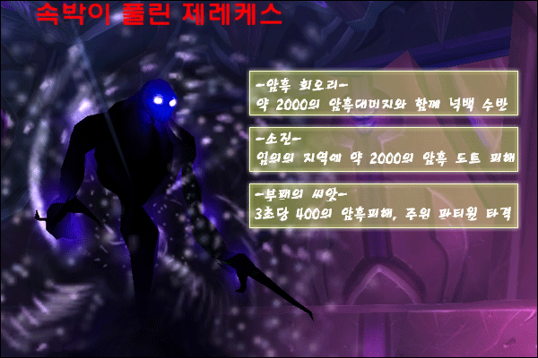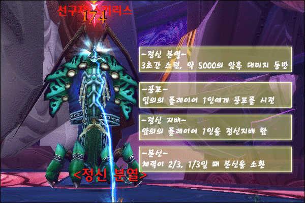 이 몬스터의 생김새는 낯설지 않습니다. 바로 안퀴라즈 사원의 첫 번째 네임드 보스인 스케람과 닮았기 때문입니다. 외모뿐만 아니라 하는 행동 역시 닮았는데 체력이 2/3이 되었을 때와 1/3이 되었을 때 각각 자신의 분신 하나를 소환합니다. 분신을 소환할 때는 스키리스 자신에게 걸려 있던 모든 디버프가 사라져 스키리스와 분신을 구별하기 힘들어지는데 이때를 대비해 스키리스에게 전술 마크 하나를 박아두는 센스를 발휘하면 유용합니다. 소환된 분신은 본체에 비해 상당히 약하기 때문에 분신을 선점사해서 죽입니다. 분신보다 무서운 스키리스의 스킬은 정신 분열인데 초당 1500의 대미지를 3초간 입히는 스킬입니다. 물리 대미지보다 훨씬 주의해야 할 스킬이며 이 스킬을 당한 후에는 붕대질을 적극 활용하는 것이 좋습니다. 적절한 힐과 자생, 분신의 선점사만 잘 이루어진다면 생각보다 쉽게 클리어 할 수 있습니다. 비록 가장 어려운 5인 인던이지만 공략법과 자신의 직업이 할 일만 잘 파악하고 있다면 문제 없이 공략 가능할 것입니다. ^^