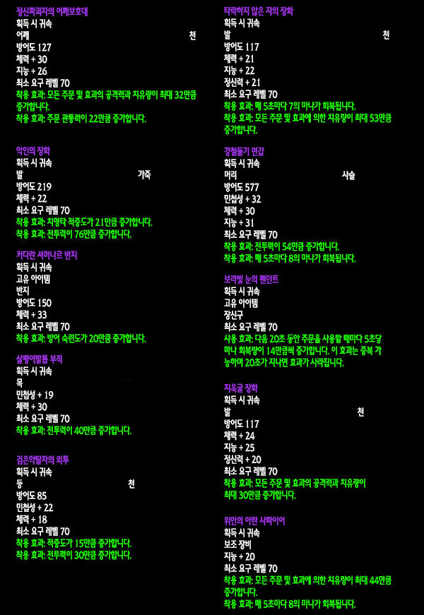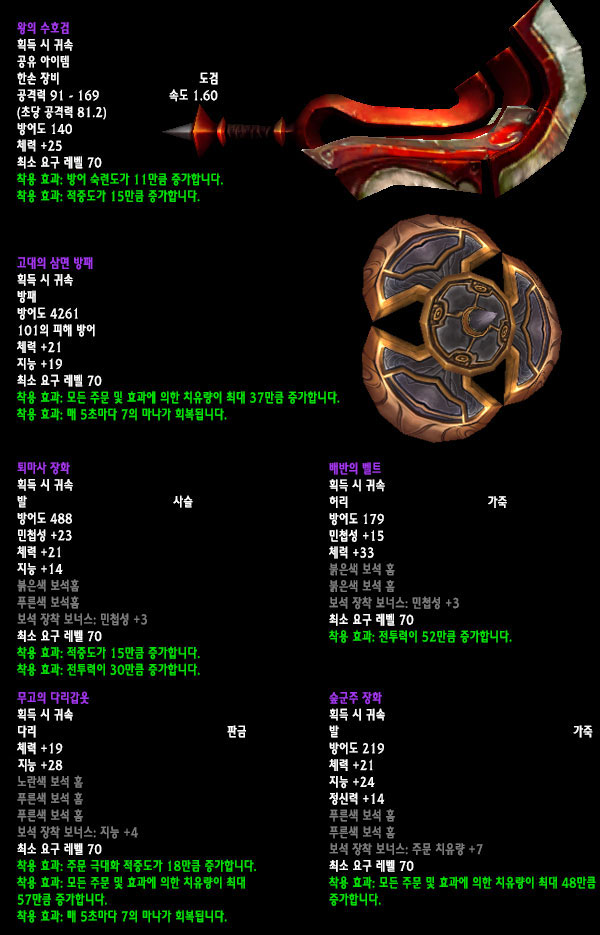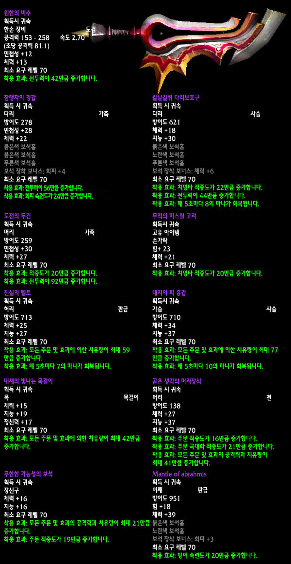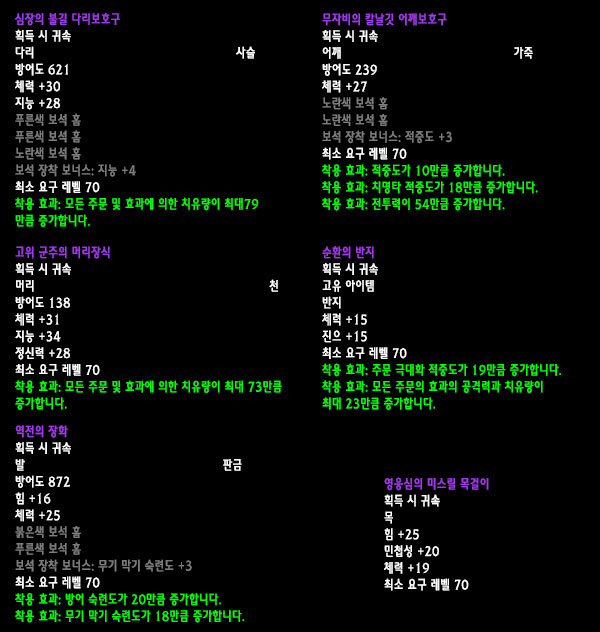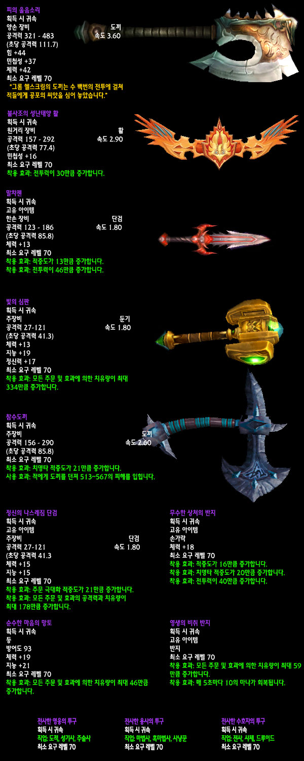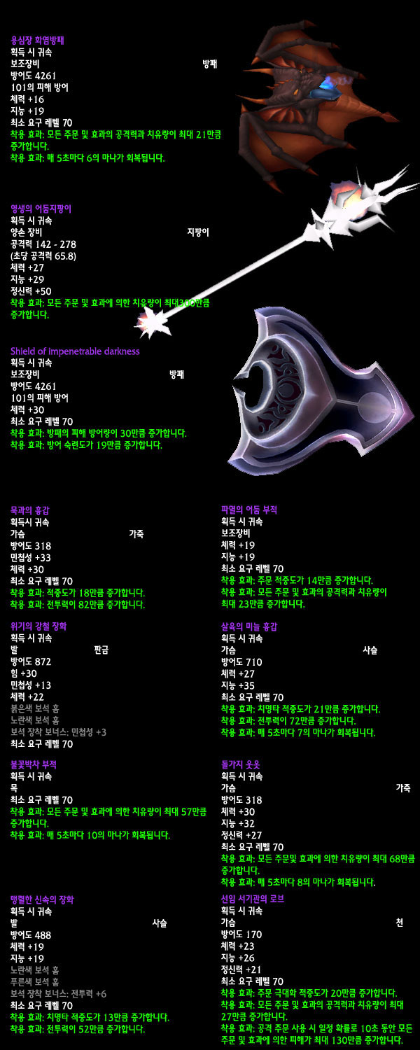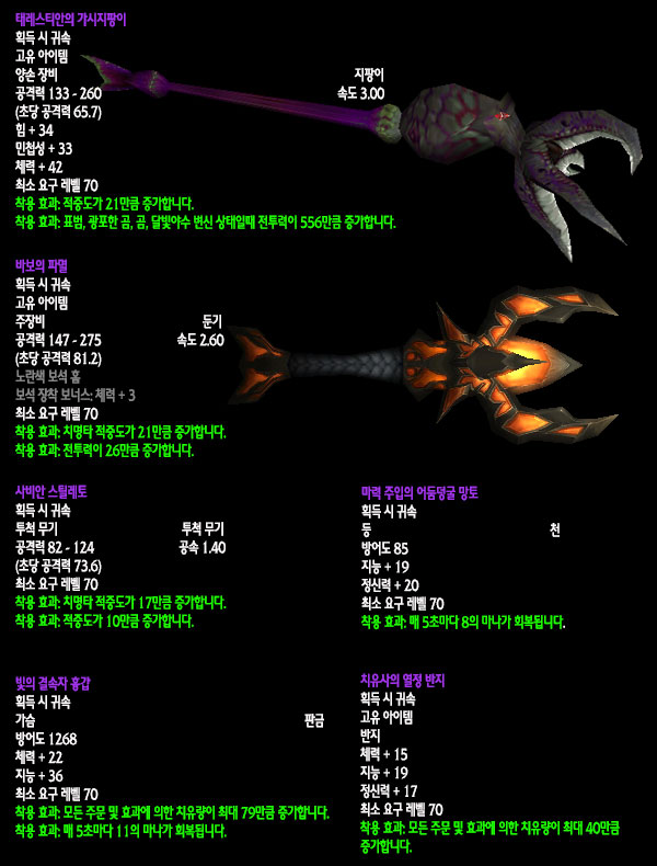 자료수집: 불타는 군단 서버 `안다이어` 아웃랜드 첫 번째 레이드 인스턴스 던전인 `카라잔` 아이템을 정리해보았습니다. 드랍아이템을 미리 볼 수 있는 애드온이 많이 퍼져 미리 보신 분들도 있겠지만 아직 카라잔을 구경하지 못한 분들이나 아직 공략되지 않은 보스들 때문에 볼 수 없었던 아이템을 보고 싶은 분들에게는 괜찮은 정보라 생각됩니다. 참고 사이트: