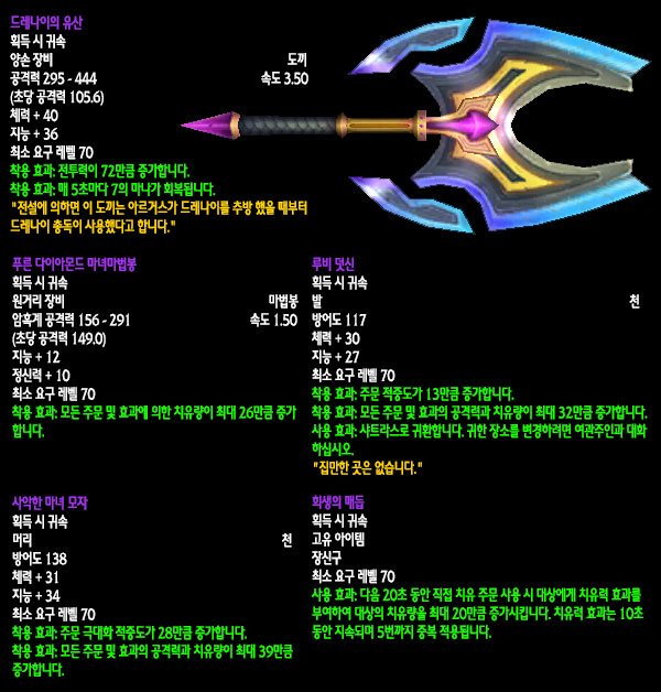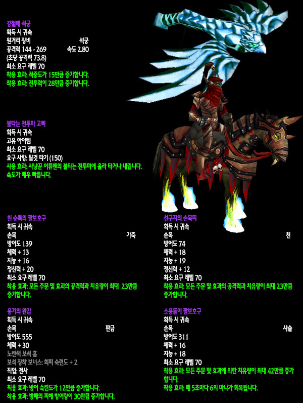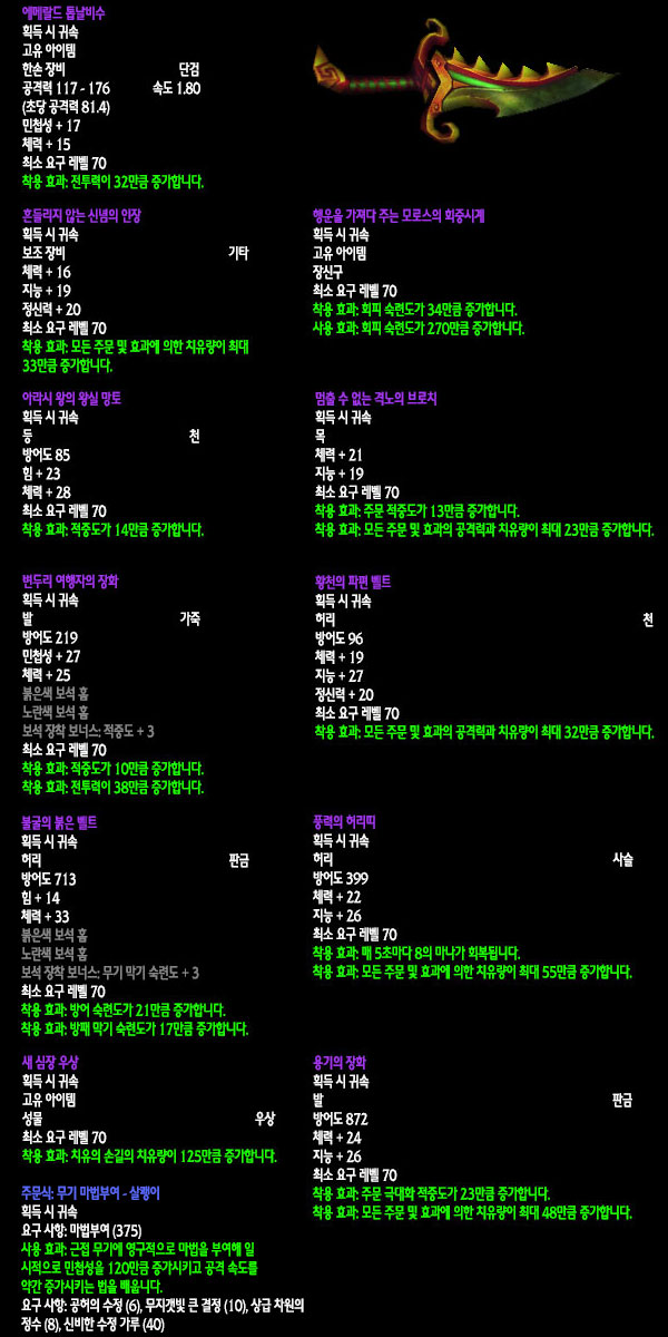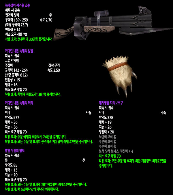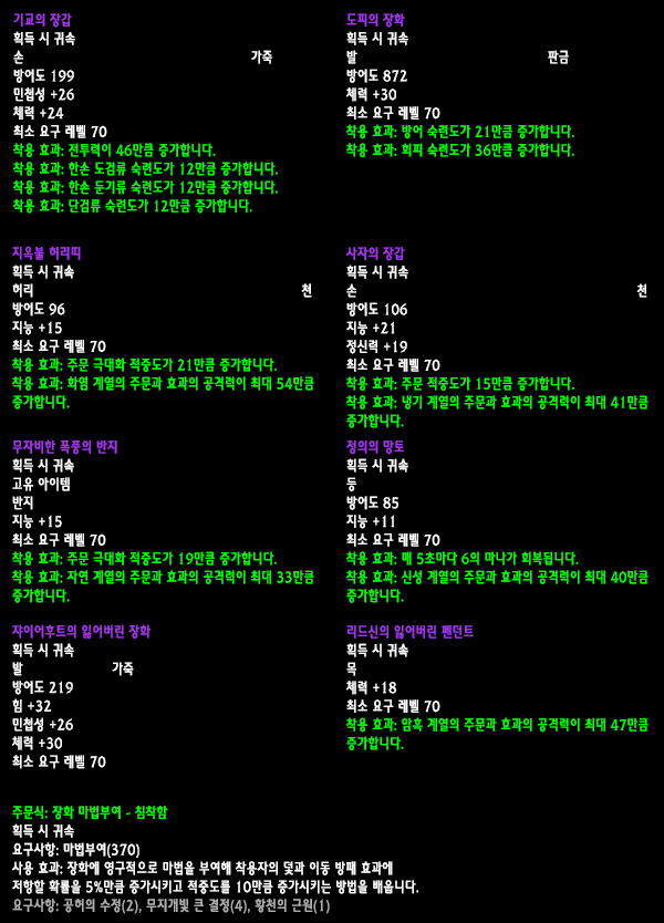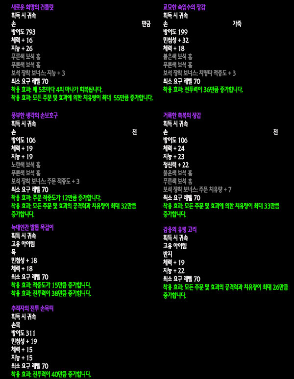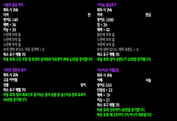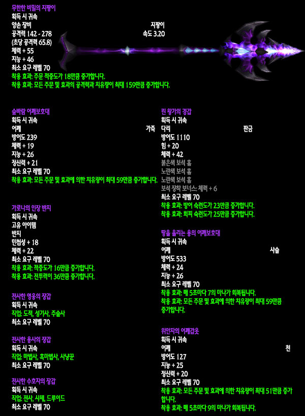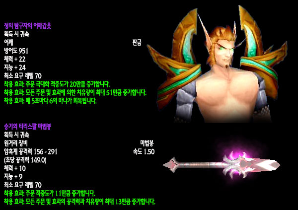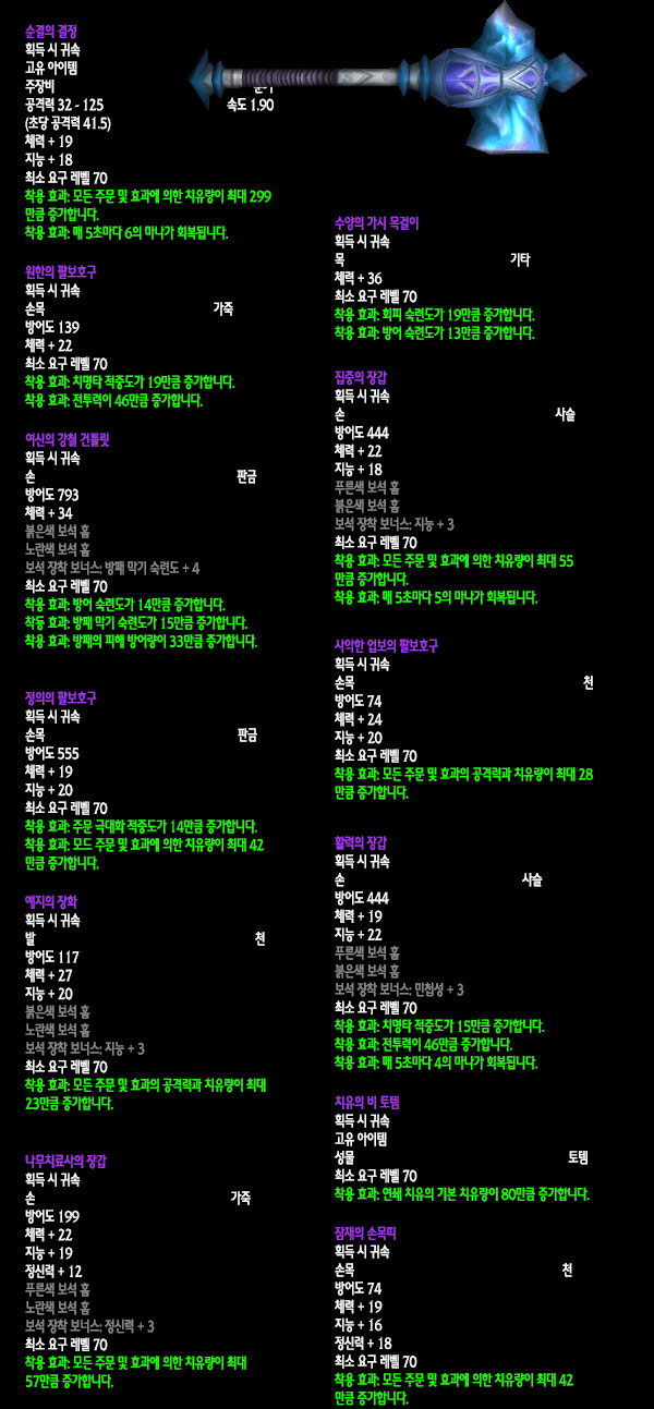 자료수집: 불타는 군단 서버 `안다이어` 아웃랜드 첫 번째 레이드 인스턴스 던전인 `카라잔` 아이템을 정리해보았습니다. 드랍아이템을 미리 볼 수 있는 애드온이 많이 퍼져 미리 보신 분들도 있겠지만 아직 카라잔을 구경하지 못한 분들이나 아직 공략되지 않은 보스들 때문에 볼 수 없었던 아이템을 보고 싶은 분들에게는 괜찮은 정보라 생각됩니다. 참고 사이트: