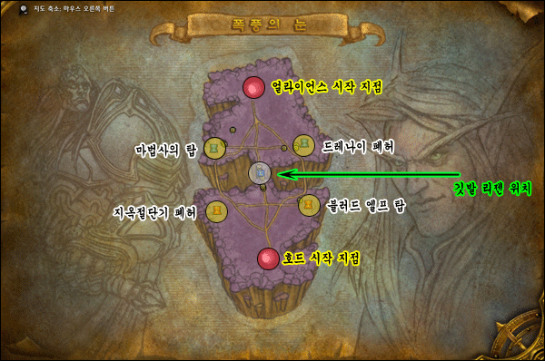 이곳은 아라시 분지와 전쟁노래 협곡이 절묘하게 믹스된 전장이라고 볼 수 있습니다. 4개의 거점을 점령해 점수를 먹는 것은 아라시 분지와 같으며 맵 중심부의 깃발을 가져와 아군의 진영에 꽂는 것은 전쟁노래 협곡의 그것과 닮아 있습니다. 거점을 상대 진영보다 많이 점령하고 깃발을 최대한 많이 날라 먼저 2000포인트에 도달하는 진영이 우승을 하게 됩니다. 4개의 거점은 마법사 탑, 드레나이 폐허, 지옥절단기 폐허, 블러드 엘프 탑으로 이루어져 있습니다. 이 4개의 거점에서는 아라시 분지처럼 이동 속도 100%증가, 공격력 30%증가/받는 피해 10%증가 등의 이로운 버프 효과를 주기적으로 받을 수 있습니다.