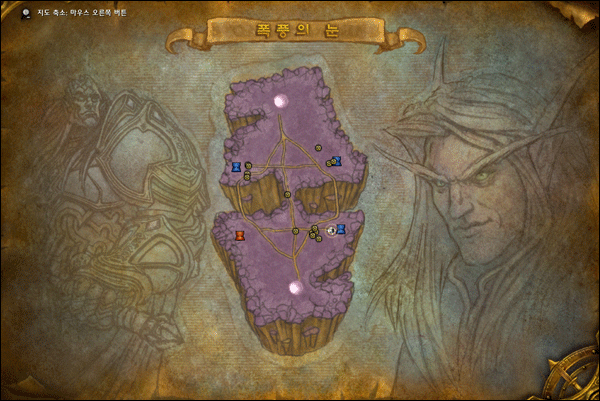 얼라이언스는 북쪽에서 호드는 남쪽에서 시작합니다. 시작과 동시에 지상의 탈것을 타고 뛰어야 하는데 이때 낙하 대미지를 주의해야 합니다. 하늘을 나는 탈것은 사용할 수 없습니다. 폭풍의 눈의 중심에는 깃발 1개가 나타납니다. 이 깃발을 따 아군이 점령한 거점으로 가져오게 되면 대략 70에서 100의 점수를 얻습니다. 이 점수는 거점을 점령해서 얻는 점수에 합산됩니다. 고로 이곳은 거점을 최대한 많이 점령함과 동시에 깃발을 최대한 많이 날라야 하는 전장입니다.