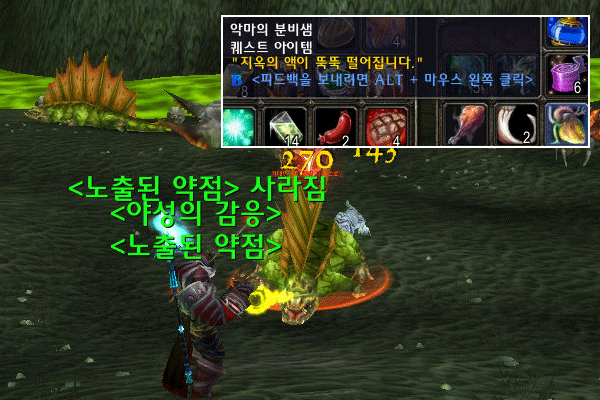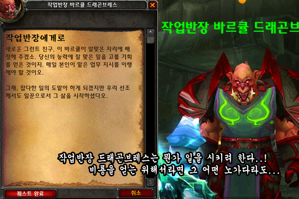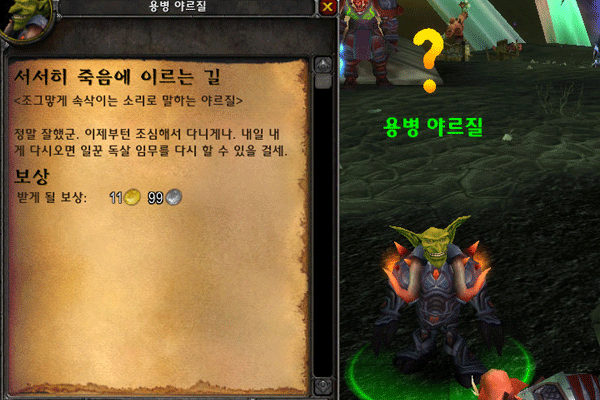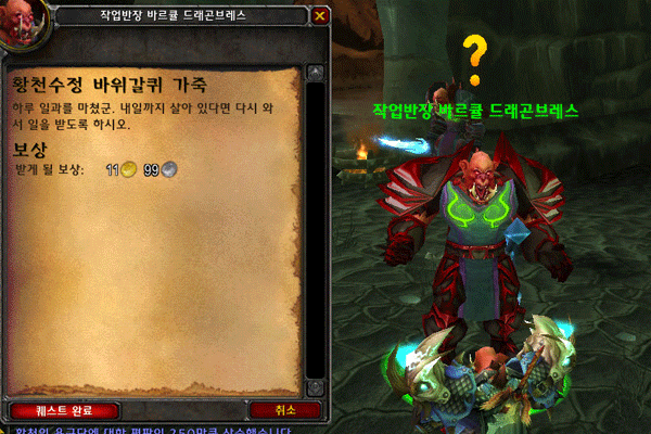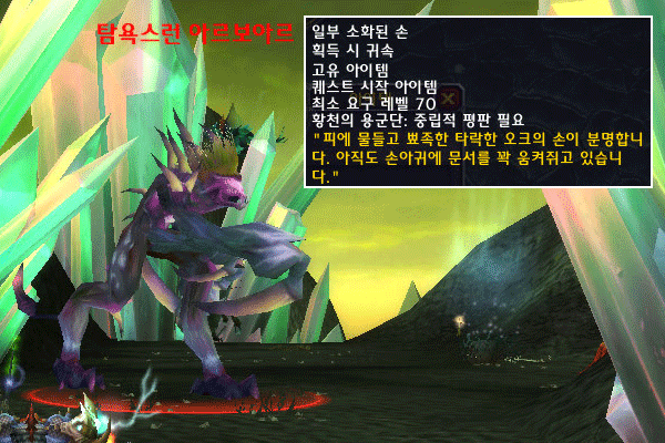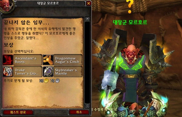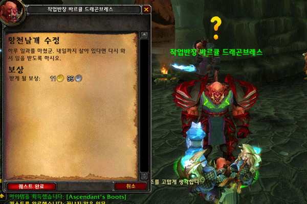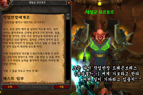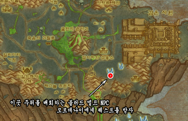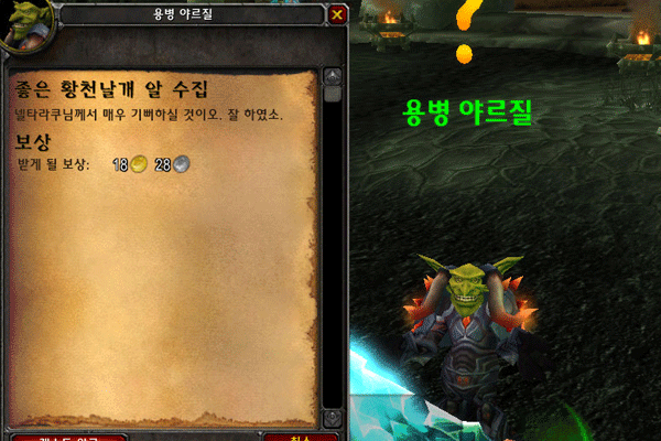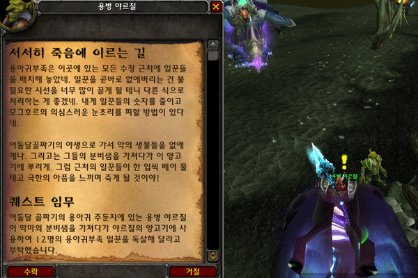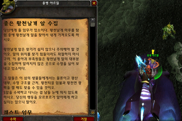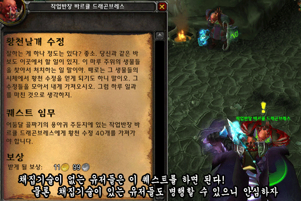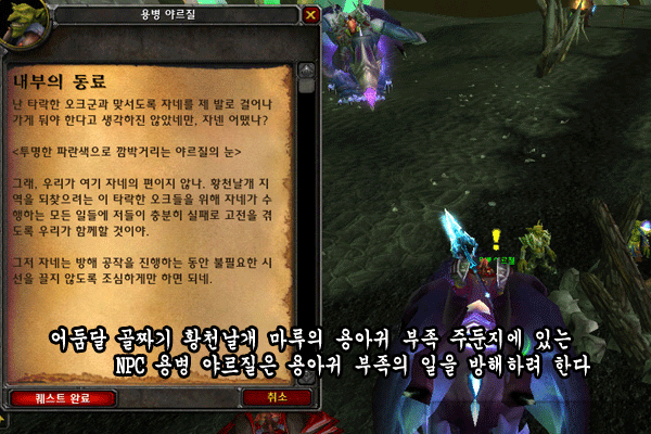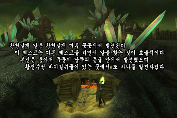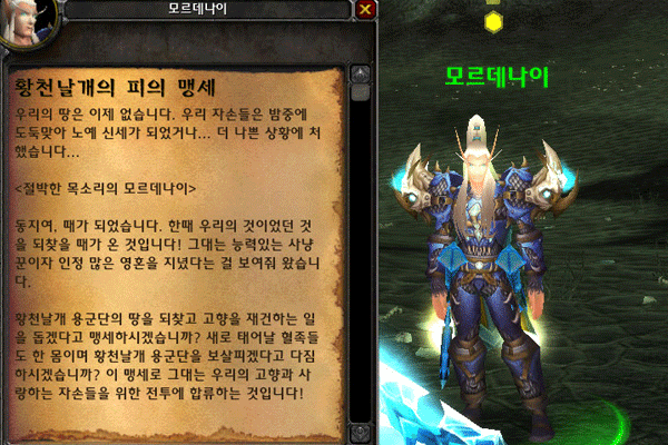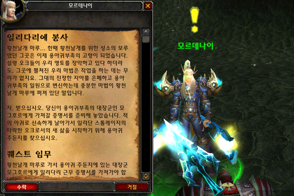 첫 퀘스트인 `황천날개의 피의 맹새`는 퀘스트 수락과 동시에 완료 된다. 겉은 블러드 엘프의 모습을 하고 있지만 정체는 황천의 용족인 모르데나이의 다급함을 느낄 수 있다. 싱거운 퀘스트... ^^;