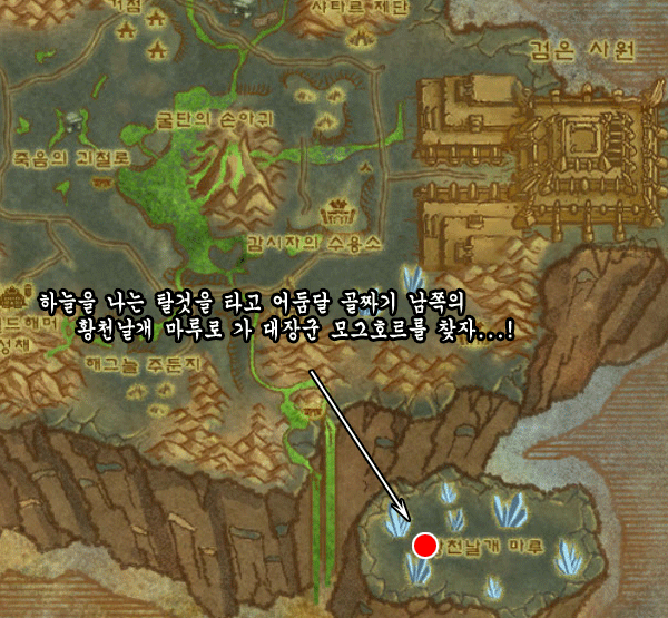 2.1.0패치에 드디어 황천의 비룡이 업데이트 된다. 황천의 비룡은 속도 280%의 하늘을 나는 탈것이며 얼라이언스와 호드 상관 없이 중립적인 퀘스트를 통해 올린 평판으로 획득할 수 있다. 황천의 비룡을 얻기 위해서는 황천의 용군단 평판이 확고한 동맹이 되어야 하며 이 평판 진영은 어둠달 골짜기의 남쪽 외진 섬인 황천날개 마루에 자리하고 있다. 황천의 용군단 평판을 올리기 위해서는 우선 어둠달 골짜기의 퀘스트인 `친절` ~ `늙은 줄루헤드`를 수행해야 한다. 그렇지 않으면 황천의 용군단 평판 퀘스트를 수행할 수 없다. 황천의 비룡 퀘스트는 `친절`퀘스트를 수행했던 어둠달 골짜기의 NPC 모르데나이로부터 시작된다. 그는 어둠달 골짜기 남동쪽의 용아귀 요새 좌측 벌판을 배회하고 있다. 황천의 용군단 평판 퀘스트는 무한 반복 수집/사냥 일일 퀘스트(개당 하루에 1번, 하루에 총 10번만 수행 가능한 퀘스트)들로 대부분이 이루어져 있다. 이제 플레이어는 황천의 용군단으로 위장하여 그들을 위한 일을 해주고 황천의 비룡을 얻어야 한다. 자 그럼 퀘스트를 시작해보자!