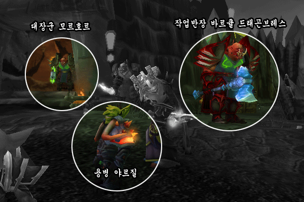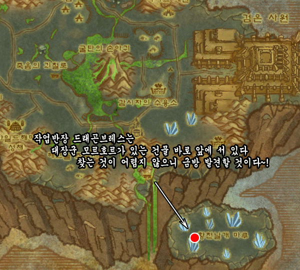어둠달 골짜기 황천날개 마루 용아귀 주둔지의 대장군 모르호르는 작업반장 드래곤브레스를 찾아가라고 한다. 드래곤브레스는 모르호르가 있는 건물 앞에 서 있어 쉽게 찾을 수 있다.