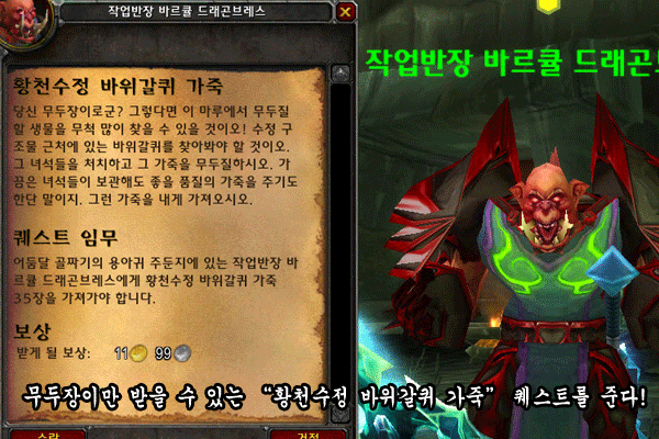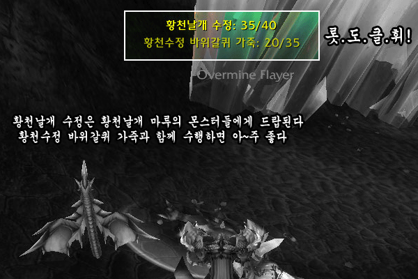 `황천수정 바위갈퀴 가죽`은 일일 퀘스트이다. 때문에 하루에 한 번만 수행할 수 있다. 이 퀘스트는 무두질을 익힌 플레이어만 수행할 수 있으며 약초 채집을 하는 유저와 채광을 하는 유저들은 또 다른 퀘스트를 받게 된다. 약초와 채광 플레이어를 위한 퀘스트는 아래 링크로 가면 볼 수 있다. 황천날개 마루의 중심부, 하늘을 나는 탈것으로만 갈 수 있는 융기된 지역에 황천수정 바위갈퀴들이 서식하고 있다. 강력한 몬스터는 아니지만 오밀조밀하게 모여 있고 리젠 타임이 빨라서 조심이 사냥을 해야 한다. 또한 이곳에는 뒤에 나올 퀘스트에 관련된 정예 몬스터가 2마리나 로밍하기 때문에 더욱 더 각별한 주의가 필요하다. 바위갈퀴를 죽이고 그 시체를 무두질하면 퀘스트 아이템이 나오는데 드랍률이 엄청 낮으니 각오를 하고 시작하자. [채광 플레이어가 받는 퀘스트 `황천연 광석` 보러가기] [약초 채집 플레이어가 받는 퀘스트 `황천티끌 가루` 보러가기] 이 퀘스트는 아래에 나올 퀘스트인 `황천날개 수정`, `끝나지 않은 임무`, `좋은 황천날개 알 수집` 등과 함께 수행하면 좋다. 1회 완료할 때마다 11골드 99실버와 황천의 용군단 평판 250을 받는다!