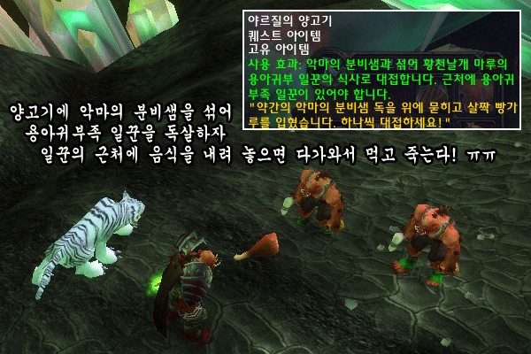 황천날개 마루 용아귀 주둔지의 용병 야르질은 용아귀 부족을 방해하기 위해 음독 살해를 계획한다. 퀘스트를 받은 플레이어는 어둠달 골짜기와 황천날개 마루의 몬스터를 잡아 악마의 분비샘을 획득하고 NPC 야르질에게 받은 야르질의 양고기에 섞어 용아귀 주둔지 근처의 일꾼들을 죽여야 한다. 악마의 분비샘은 황천날개 마루와 어둠달 골짜기의 모든 야생 생물들이 드랍한다. 독을 탄 양고기를 일꾼 근처에 놓으면 다가와서 먹고 죽는다. 하나의 양고기에 몇 명의 일꾼이 모이든 관계 없이 카운트는 1로 된다. 일일 퀘스트이며 완료하면 11골드 99실버와 황천의 용군단 평판 250을 받는다.
