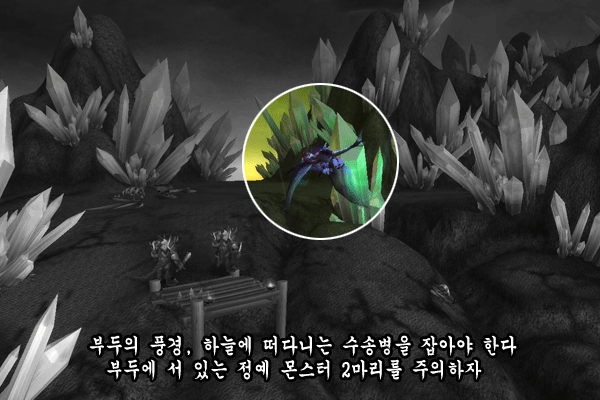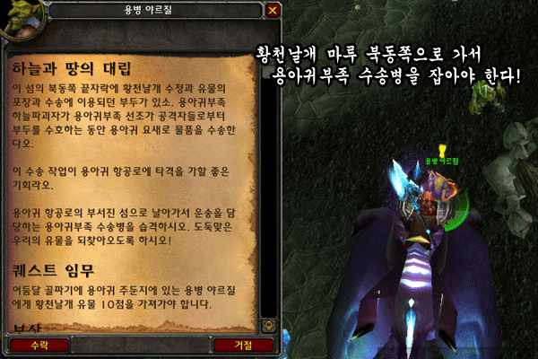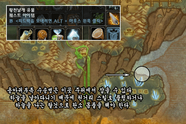 황천날개 마루 용아귀 주둔지의 NPC 용병 야르질은 용아귀부족 수송병을 잡아 황천날개 유물을 가져오라고 한다. 용아귀부족 수송병은 황천날개 마루 북동쪽에 나타난다. 황천의 비룡을 타고 하늘을 날아 다니는 수송병은 그들이 왕복하는 루트 아래의 섬에 자리를 잡고 풀링하여 잡으면 수월하다. 아래 스크린샷을 참고하자. 일일 퀘스트이며 완료 시 11골드 99실버와 250의 황천의 용군단 평판 250을 받는다.