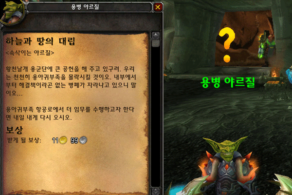 용아귀 주둔지의 고블린 NPC야르질은 용아귀 부족의 일을 방해하기 위해 존재한다. 그에게 말을 걸어 퀘스트를 받자. 그에게 받을 수 있는 첫 퀘스트 `내부의 동료`는 수락과 동시에 완료가 되는 퀘스트다.
