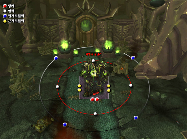 매인탱커: 메인탱커는 두 명이다.  방어구 으깨기가 3~4회 누적되면 공격대 창으로 외치기를 하여(매크로 활용) 두 번째 메인탱커가 이를 인계하고 힐러들은 인계된 탱커에게 힐을 집중해야 한다. 강타에 적중하면 한방에 8천정도 빠지므로 지휘의 외침을 써서 최대 피통을 늘려주는 것이 좋다.
