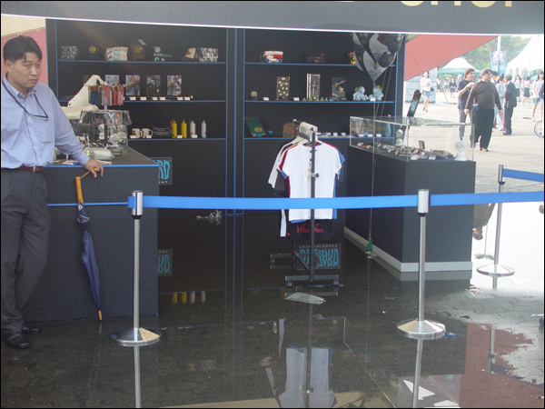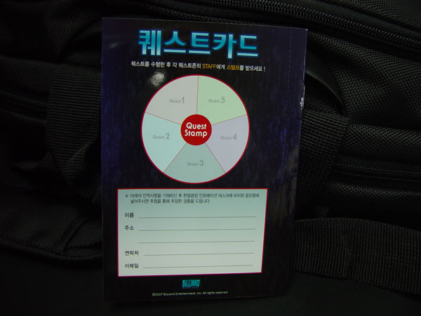 가까운 펜싱경기장으로 가봤는데 이곳에서는 여러 가지 즐거운 이벤트가 펼쳐지고 있었습니다. WWI 행사장을 입장할 때 받는 입장권 뒷면에는 퀘스트 카드란이 있는데 이것을 모두 수행하면 추첨을 통해 푸짐한 상품을 받게됩니다. 얼핏 보니 모니터, MP3등등 뭐가 많더군요 ^^: 헌데 퀘스트는 어디서 하느냐? 바로 펜싱경기장인 것이죠.