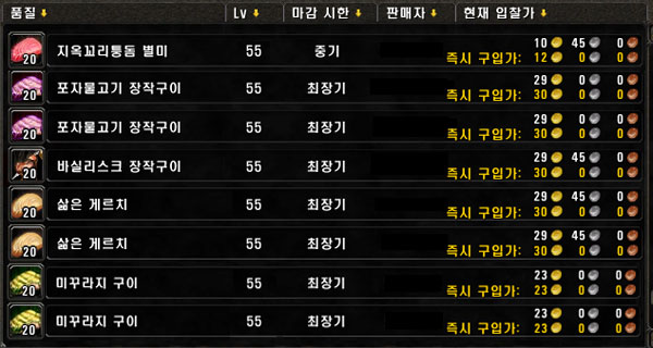 ▲이때 만들게 되는 요리들은 경매장에도 꽤 괜찮은 가격에 내놓을 수 있습니다. [황금 화살고기]는 `테로카르 숲` 지상의 강줄기를 따라 물고기떼가 분포해있지만 그냥 낚시를 통해서도 낚을 수 있는 어종이다. 문제는 바로 [사나운 가재]에서 발생하는데, 70레벨에 도달한 뒤 하늘을 나는 탈 것을 구매한 플레이어만 올라갈 수 있는 지역인 스케티스에서 서식하기 때문이다. 또한 낚시를 위해 필요한 숙련도도 매우 높다(약 430 이상). 재료를 구하는 것 자체가 어려워지기 때문에 요리 숙련도를 올리는 것 역시 어려워질 수 밖에 없는 것이다. 패치를 통해 대안으로 등장한 [낚시꾼의 별미]와 [송어 버터 구이]의 재료도 쉬운 편만은 아니다. [거대한 점박이지옥꼬리퉁돔]과 [엄청나게 큰 미늘아가미송어]는 매우 낮은 확률로 장가르 습지대에서 낚이는 물고기들로 특이하게 보조장비로 착용할 수 있는 어류다. 다만 이들은 겹쳐지지가 않기 때문에 보관이 불편하다는 점이 문제가 된다. 70레벨을 찍고 낚시를 올려서 [사나운 가재]를 구하는 것과 재료를 구하기 위해 들게 되는 시간은 길게 보았을 때 그다지 차이가 없다. 일단 300~335숙련도를 올리면서 앞선 재료들을 모아두고, 부족한 부분을 레벨업 한 뒤 [사나운 가재]를 구해 마저 올리는 것이 가장 현명한 선택인 듯 하다.
