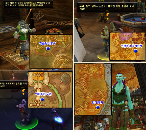 스톰윈드 대성당 광장에 있는 제스퍼와 오그리마의 명예의 골짜기에 있는 스풉스는 몸이 아파서 사탕을 받으러 다니지 못하는 아이들이다. 아이들이 초롱초롱한 눈망울을 한 채 사탕을 갈구하고 있으니, 우리가 나서서 도와주도록 하자. 이 사탕을 얻는 방법도 재미있는데, 대도시에 위치한 여관주인들과 몇몇 NPC에게서 간단한 퀘스트를 수행하면 된다.