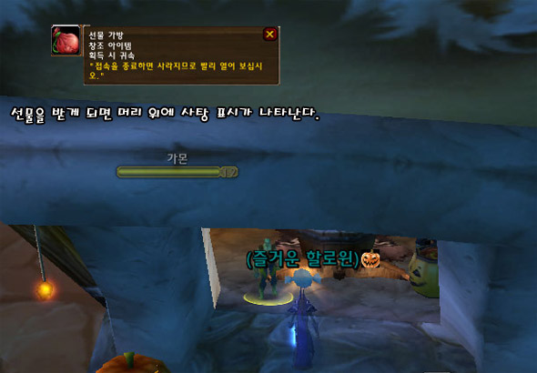 이렇게 받은 선물을 열어 보면 할로윈과 관련된 다양한 아이템이 나온다. 어찌 된 일인지 필자가 선물을 달라고 하면 개구리에 위습, 디아블로-_-등으로 변신만 시키고 선물은 잘 안 줘서 많은 정보를 얻지는 못했다 ㅠㅠ