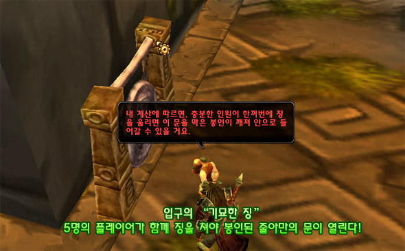 줄아만에 처음 들어서면 거대한 입구가 닫혀있는 모습에 당황하게 될 지도 모른다. 이 문은 플레이어의 무력으로 열 수 있는 문이 아니다. 줄아만의 타임어택의 첫 시작을 끊기 위해서는, 바로 이 NPC에게 말을 걸어야만 한다.