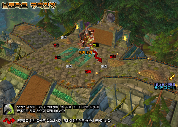 그리고 딜러들은 최대한 자가 붕대힐을 재사용 대기시간이 허락하는 한도까지 활용해주자. 날로라크는 쉴 새 없이 힐이 들어가야 하기 때문에 힐러의 마나 부담이 매우 큰 보스이다. 힐러들의 마나가 바닥을 보이는 순간, 공략도 실패하게 된다는 생각을 가지고 공략에 임하자.