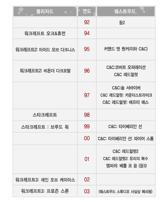 지금부터 RTS의 양대산맥으로 통하는 블리자드와 웨스트우드간의 라이벌 전을 다루고자 한다. ‘듄2’를 시작으로 웨스트우드가 EA에 합병되는 8년 동안, 이 두 개발사는 RTS 대권을 놓고 치열한 경합을 펼친다. 우연인지 필연인지 블리자드와 웨스트우드는 서로 비슷한 시기에 게임을 출시했고 대결했다. 본격적인 두 RTS 명가의 대결. 지금부터는 그 8년간의 이야기다.