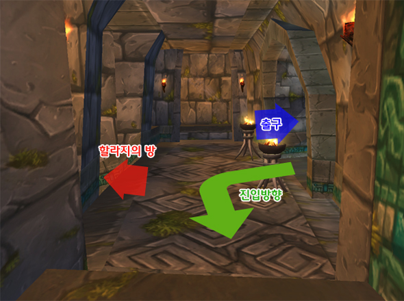 건물 내부에는 할라지 외에도 화염술사와 수호병 등의 잔몹이 있는데, 이들은 입구 쪽에 있는 공간에서 처치하면 된다. 단, 화염술사의 광역 화염구와 화염 숨결이 강력한 편이기 때문에 좁은 공간을 잘 활용하여 처치해야 할 것이다. 화염술사는 매즈가 가능하니 되도록 매즈를 해 주고 맨 마지막에 처치하는 것이 좋다.