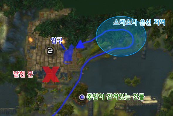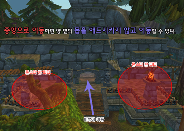 제단에 도착하면 건물 양쪽에 있는 트롤들이 보일 것이다. 길 중앙으로 이동하면 이 트롤들은 패스할 수 있다.