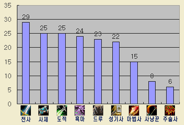 가장 먼저 살펴볼 부분은 어떤 직업이 가장 많은가에 대한 것입니다. 투기장은 인원수에 따라서 환영받는 클래스와 그렇지 못한 클래스의 편차가 심한 편인데요, 3v3에서는 어떤 직업이 가장 사랑 받고 있는지 살펴보시죠.