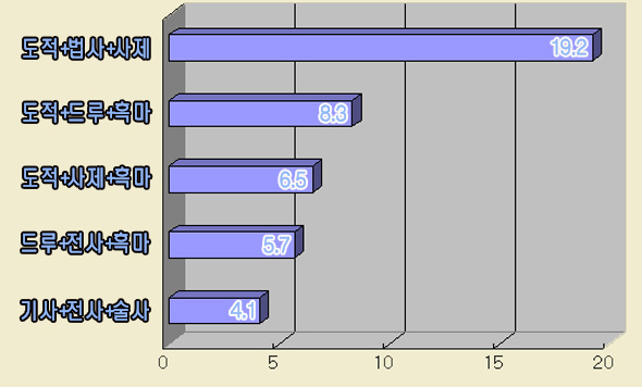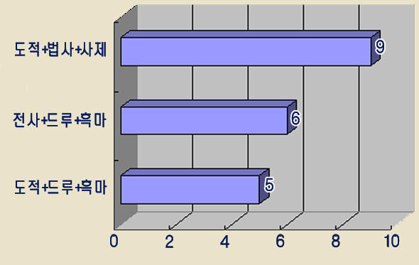 도적+법사+사제 조합이 압도 적으로 많네요. 두 배 이상 차이가 나는 걸 보면 이 조합의 효율이 얼마나 좋은 지를 알 수 있습니다. 그 뒤를 이은 조합들에는 도적과 흑마, 드루이드, 전사가 많이 보이는군요.