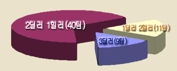 마지막으로 어떤 구성의 팀이 사랑 받는지를 살펴 보았습니다. 3v3 투기장의 경우엔 3 딜러와 2딜러 1힐러, 1딜러 2힐러의 세 가지 조합이 가능하죠. 물론 3 힐러로 구성하는 것도 가능하겠지만, 상대를 때려 눕혀야 하는 투기장에서 3힐러는 의미가 없기 때문에 제외 했습니다.