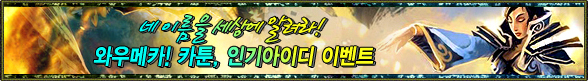 07년 12월 21일 오후 2시부터 08년 1월 18일 밤 11시 50분까지 진행한 "네 이름을 세상에 알려라 와우메카! 카툰, 인기아이디"이벤트가 많은 회원님들의 참여로 성황리에 종료되었습니다. 참여하신 모든 분들께 경품을 모두 나눠드리고 싶은 마음은 간절하지만 한정된 경품으로 인해 참여자분들 중 심사 숙고하여 당첨자를 선정하였습니다. 참여하신 모든 분들께 진심으로 감사의 말씀을 전합니다.