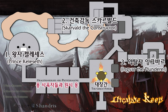 납골당에는 총 세 명의 네임드가 등장하는 것으로 알려졌습니다. 첫 번째임드는 왕자 켈레세스입니다. 설정에 의하면 브리쿨족은 노스렌드의 또 다른 지역인 걀레르브론(Gjalerbron)과 요새를 오갈 수 있는 지하 터널을 뚫고 있다고 합니다. 하지만, 브리쿨족은 육체노동보다는 전투와 어울리는 종족이죠. 그래서 왕자 켈레세스가 터널을 파는 데에 사용할 스컬지 병력을 이끌고 대사로서 나온 상황이라고 합니다. 브리쿨 요새에 언데드가 등장하는 데에는 이런 이유가 있었네요. 공개된 정보에 의하면 켈레세스와의 전투는 스트라솔름의 남작 리븐데어와 카라잔의 테레스티안 일후프를 적당히 버무려 놓은 형태가 될 듯합니다. 켈레세스는 다섯 마리의 해골 병사를 소환해 내며 주기적으로 플레이어 중 하나를 얼음 감옥에 가두어버린다고 하는군요. 이 얼음 감옥은 일후프가 사용하는 악마의 사슬과 같은 형태로 갇혀 있는 플레이어는 지속적인 피해를 입게 되며 지속시간이 30초이기 때문에 다른 파티원들이 감옥을 부수어야 합니다. 스크린 샷이나 동영상이 공개되었다면 좋겠지만 아쉽게도 구할 수가 없었습니다. 블리즈컨 당시에 켈레세스를 잡은 사람들이 있긴 했지만 그때는 정상적인 전리품 대신 원숭이 펫을 소환할 수 있는 장난감을 드랍 했다고 하네요. 두 번째 네임드인 건축학자 스카르발드와 마지막 네임드인 약탈자 잉그바르는 그 이름만이 공개되었을 뿐 세부적인 정보는 공개되지 않았습니다. 알려진 정보는 이들 모두 브리쿨족이라는 것뿐이군요. 다른 5인 던전인 우트가르드 첨탑과 공격대 인던은 80레벨 제한의 인던이라는 점 외에는 공개된 정보가 없습니다. 하지만, 리치왕의 분노 공식 홈페이지에서 얻을 수 있는 정보에 의하면 브리쿨족의 지도자인 이미론 왕은 아직 잠들어 있는 상태라고 하니 공격대 인던에서는 깨어난 이미론 왕과의 혈전이 벌어지지 않을까 하는 추측을 해 볼 수도 있겠습니다. 반거인족 브리쿨, 다섯 용군단과는 공통점이 없는 원시용, 그리고 브리쿨족을 도우러 파견된 스컬지 군단에 맞서게 되는 우트가르드 요새. 매우 기대되는 던전 중 하나임에는 틀림없습니다.