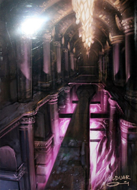 마력의 탑은 본래 푸른용혈족 위상 말리고스의 배타적인 영토였습니다. 이곳은 신비로운 콜다라의 넓은 지역에 걸쳐 무수한 동굴과 통로들로 뿌리내리고 있습니다. 모든 공간에는 조각이 새겨져 있거나 부드럽게 연마되어 있으며 마치 성채 하나를 얼음 아래로 묻어둔 것처럼 보이기도 합니다. 벽은 얼음과 수정으로 이루어져 있으며 전략적으로 보이는 장소에는 일렁거리는 보석들 사이로 무지개가 드리워져 있습니다. 바닥은 단단한 돌이나 흠집 하나 없어 보이는 유리, 빛나는 거울 같은 느낌의 것들로 이루어져 있습니다. 계단은 존재하지 않고 곳곳에 아치형의 길이 있어 무수한 공간을 서로 연결해 줍니다. 아치형 길의 장점은 용들이 날아서 이동하는 데에 방해가 덜 된다는 점이겠죠. 가장 외곽 쪽에 있는 방에는 살아있는 것만 같은 얼음 조각상들이 자리잡고 있는데 불청객들-보물을 노리는 모험가 같은-이 침입했을 때 미리 걸어 둔 마법적인 힘으로 살아나 이들을 쫓아내는 역할을 수행하기도 합니다. 동굴 어딘가에는 그 존재만으로도 황홀함을 느낄 수 있을 정도로 진귀하고 매혹적인 재물들로 가득한 장소도 있습니다.