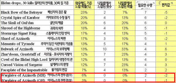 다른 아이템들에 한해서는 그다지 이상하다고 할 만한 부분은 없습니다. 뭐 아지노스의 보루 방패가 10번이나 나온 것은 좀 많다고 볼 수 있지만, 저흰 다섯 명의 보호특성 기사를 보유하고 있기 때문에 이에 대해서는 불만을 갖고 있지는 않습니다. 하지만 전투검이 0자루라니 터무니없지 않습니까? 수학적으로 따져 볼까요? 알려진 드랍률에 의하면 일리단을 30회 잡을 동안 전투검이 단 한 자루도 나오지 않을 확률은 6%(0.91^30)가 된다는 말인데 우린 그 6%의 확률을 뚫었다는 뜻이란거죠.. (후략)