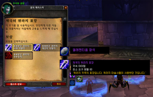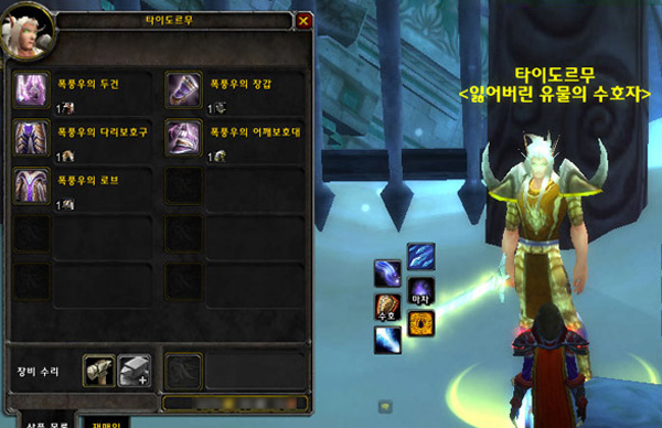 [고대신의 껍질][고대신의 허물]을 드랍했습니다)과 함께 다른 재료(주로 사원에서 구할 수 있는 우상)를 가져가서 퀘스트를 완료하는 식이었죠. 이는 줄구룹이나 안퀴라즈 폐허의 세트 아이템에도 비슷한 방식으로 적용되었습니다.