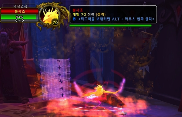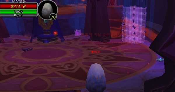 불사조는 소환된 직후 위협 수준이 가장 높은 대상에게로 천천히 이동하면서 주위에 광역 화염 피해를 입힙니다. 때문에 근접 클래스보다는 원거리 클래스가 공격해 주는 것이 좋습니다. 공격하지 않아도 불사조 스스로의 체력은 깎이긴 하지만 빠르게 처치하고 알을 깨는 것이 2단계에 대비하기에 더욱 좋을 것입니다. 참고로 불사조는 화염 피해에 면역이 아니기 때문에 화염 속성의 공격도 통합니다.