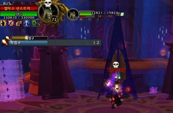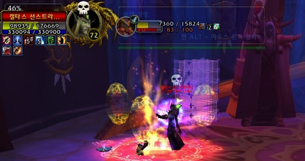 2단계가 지속되는 동안에는 모두가 비전 구슬을 피해서 바쁘게 움직여야 합니다. 디버프로 인한 지속적인 피해도 들어오기 때문에 힐러는 가급적 모든 파티원의 체력을 골고루 채워 주어야 하는데 힐러가 사제나 드루이드일 경우 좀 더 수월하게 공략할 수 있을 것입니다. 힐러를 제외한 다른 인원은 캘타스를 공격하는 것 보다는 생명석이나 물약을 사용하여 최대한 살아남도록 노력하는 것이 좋습니다. 참고로 얼음 방패나 천상의 보호막 등은 중력 붕괴를 해제시켜 주지는 않지만 피해를 흡수할 수는 있습니다.