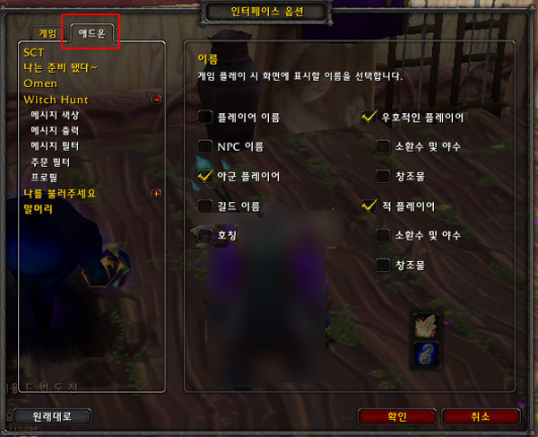 ESC - 인터페이스 옵션 - 애드온 탭을 선택하시면 Witch Hunt 설정을 볼 수 있습니다. 여기서 위치헌트의 기본적인 사항을 설정할 수 있죠. 상단(푸른색 네모)에 있는 [전투에 한정]과 [대상에 한정]을 체크해 주시면 각각 전투 중에만 혹은 자신의 대상에 대해서만 표시를 해줍니다. 하단의 [고정] 부분(붉은색 네모)에 있는 체크를 해제하시면 메세지가 표시되는 위치나 창의 크기를 변경할 수 있으니 자신이 원하는 대로 설정이 가능합니다(Build 1.9 이후에는 별도로 선택해야 설치됩니다).
