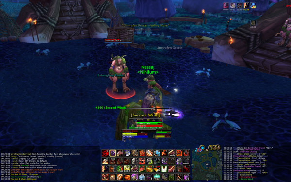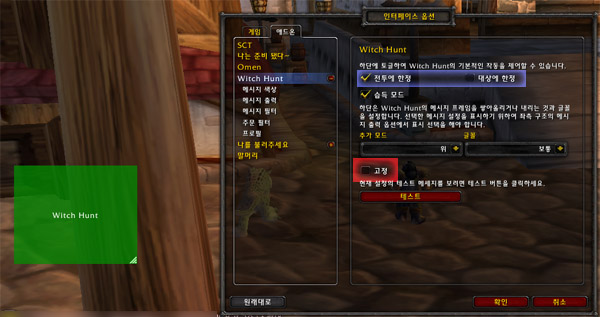 위치헌트(Witch Hunt)는 주위에서 시전되는 마법이나 능력을 텍스트로 표시해주는 애드온입니다. 아마 하늘아리를 설치하고 많은 분들이 불편해 하셨던 것이 이 마법사냥 때문이었던 것 같네요. 처음 실행하면 화면 중앙에 위치하기 때문에 텍스트가 캐릭터를 가려서 매우 불편하셨을겁니다. 이런 문제점은 간단하게 해결이 가능합니다.