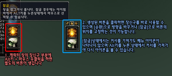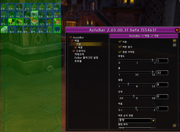 Build 1.9에서 추가된 애드온입니다. 가방을 열지 않고도 여러 아이템을 사용할 수 있도록 도와주어 부족한 단축창을 덜어주는 애드온이죠. 하지만 처음 사용하는 분이라면 갑자기 화면 한편을 차지하고 있는 아이콘들 때문에 곤혹스러울 수도 있습니다. 아주 간단한 설정을 통해서 위치나 모양을 바꿀 수 있으니 알아 볼까요? 일단 위치를 옮겨 보도록 하겠습니다.