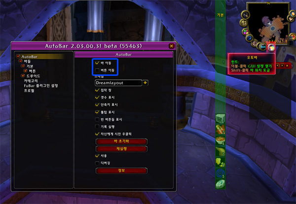 오토바의 메뉴를 띄우시면 위와 같은 화면이 보입니다. 여기서 [바 이동]을 체크하시면 오토바의 위치를 옮길 수 있으며 [버튼 이동]을 체크하시면 각 버튼의 위치를 조절하는 것이 가능하죠.