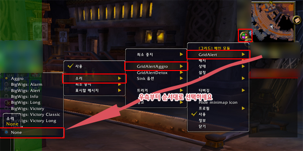 우선 그리드입니다. 미니맵에 있는 그리드의 아이콘을 우클릭하면 [GridAlert]메뉴가 보이는데요 여기서 [GridAlretAggro]-[소리]-[None]를 선택해 주면 더 이상 소리가 출력되지 않습니다.