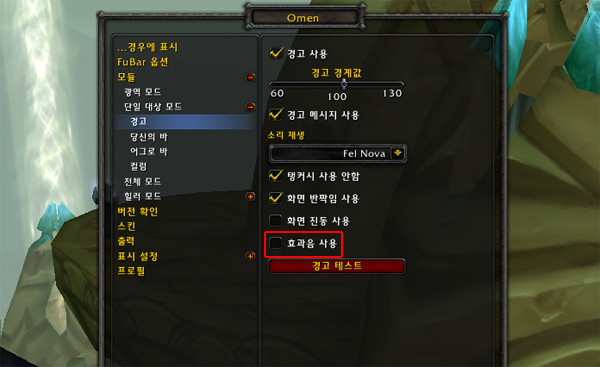 다음은 오멘입니다. 오멘은 그리드보다 설정하기가 쉬운데, 그리드와 마찬가지로 미니맵의 오멘 아이콘을 우클릭하거나 오멘 화면의 설정 아이콘을 클릭해서 설정창을 띄운 뒤 [모듈]-[단일 대상 모드]-[경고] 항목에서 [효과음 사용]의 체크를 해제하면 됩니다.