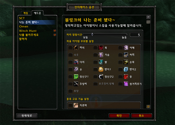 나는 준비 됐다는 애드온 제작자로 유명하신 블링크님께서 제작한, 아이템이나 스킬의 재사용 대기시간을 별도의 텍스트로 표시해주는 애드온입니다. 정신없는 PvP중이거나 네임드를 공략하는 중이라면 이런 알림 기능이 큰 도움이 되겠죠. 나는 준비 됐다는 인터페이스 설정에서 설정을 바꿀 수 있습니다.