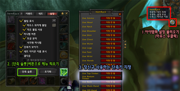 Build 1.9부터는 기존의 장신구 관리자를 아이템랙이 대신하도록 변경되었습니다. 하지만 단축키 설정하는 부분이 눈에 확 들어오지는 않아서 처음 사용하시는 분은 불편해하실 수도 있죠. 간단한 방법으로 단축키를 설정할 수 있습니다.