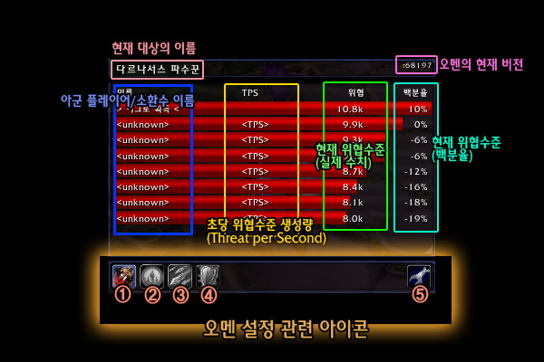 오멘을 사용할 때 가장 눈여겨볼 부분은 중앙에서 요동치는 막대 그래프입니다. 이 막대가 길 수록 현재 대상에 대한 위협 수준이 높다는 의미이며 일반적으로 가장 위에 있는 플레이어가 현재 대상(몬스터)이 공격하고 있는 파티원, 즉 탱거가 됩니다. 우측 끝에 표시되는 백분율은 현재 몬스터가 바라보는 대상(탱커)의 위협 수준을 기준으로 한 수치로 +10%라면 탱커의 위협 수준보다 10% 높은 위협 수준을 보유하고 있다는 뜻이고 -10%라면 탱커보다 10% 낮은 위협 수준을 보유하고 있다는 의미가 됩니다. 이 수치가 탱커보다 높아진다면 행동을 멈추는 것이 좋죠. 다만 원거리에서 마법을 사용하는 캐스터 계열이나 사냥꾼 같은 경우에는 탱커에 비교한 위협수준이 30%를 넘어서지만 않도록 유지하면 됩니다. 2.4.0패치 이후로 오멘이 업데이트되어 아래쪽에 설정 아이콘이 생겼는데요, 각 아이콘의 역할은 다음과 같습니다.