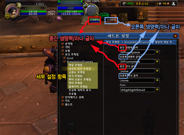 몇몇 유저분들은 하늘아리에 포함된 새로운 유닛 프레임인 SimpleUnitFrames 때문에 대상의 체력에 숫자가 겹쳐 보이는 현상을 겪으셨을겁니다. 이는 아마도 와우 자체의 유닛 프레임과 심플 유닛 프레임의 기능이 겹쳐서 일어나는 현상인 듯 합니다. 간단한 방법으로 이런 현상을 해결할 수 있습니다.